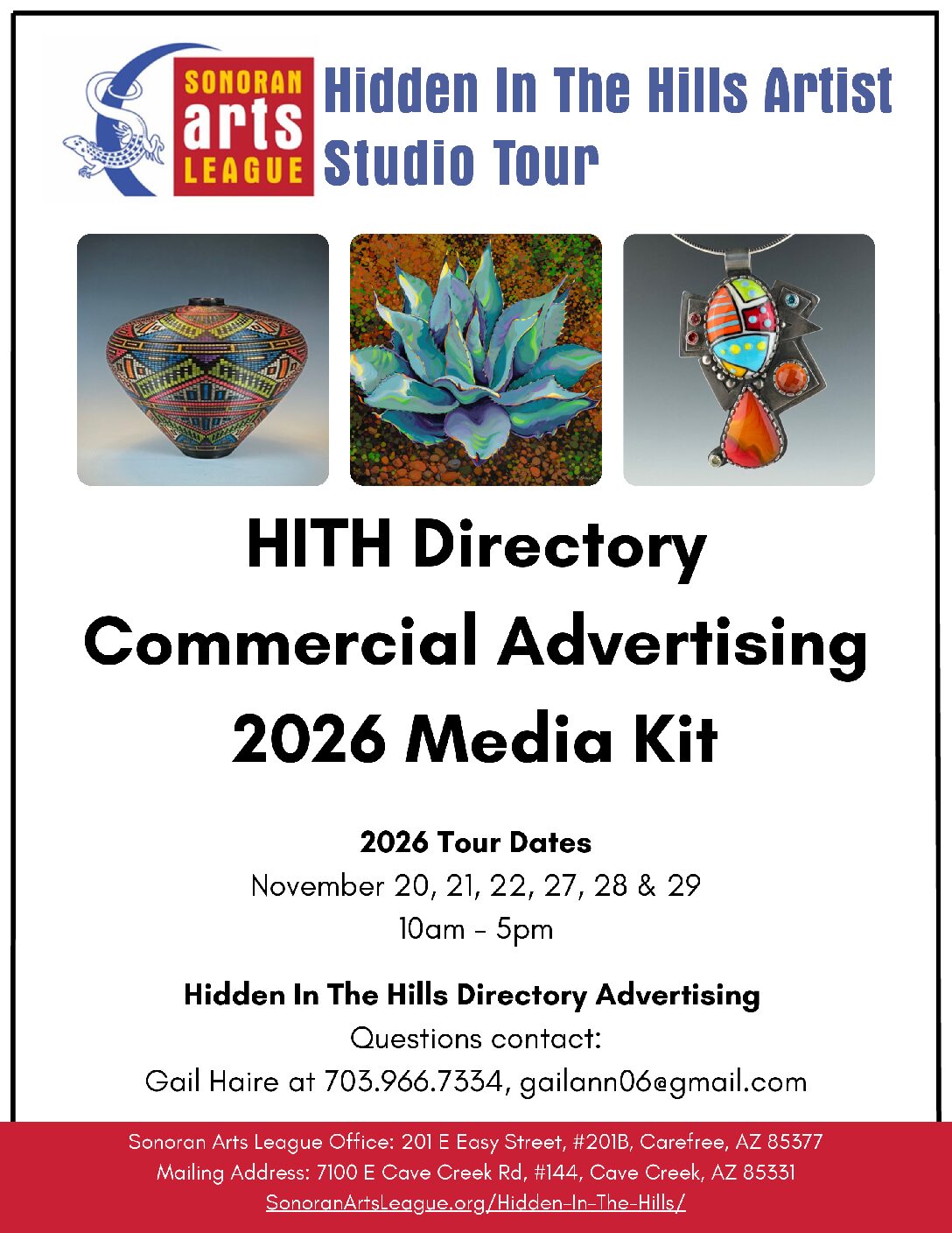 The Hidden in The Hills Artist Studio Tour, presented by the Sonoran Arts League, provides an opportunity for the public to visit the workspaces of dedicated artists in the Sonoran Foothills, to learn about the artist’s methodology and process, and purchase art directly from the artists in a friendly, engaging atmosphere that showcases quality art.