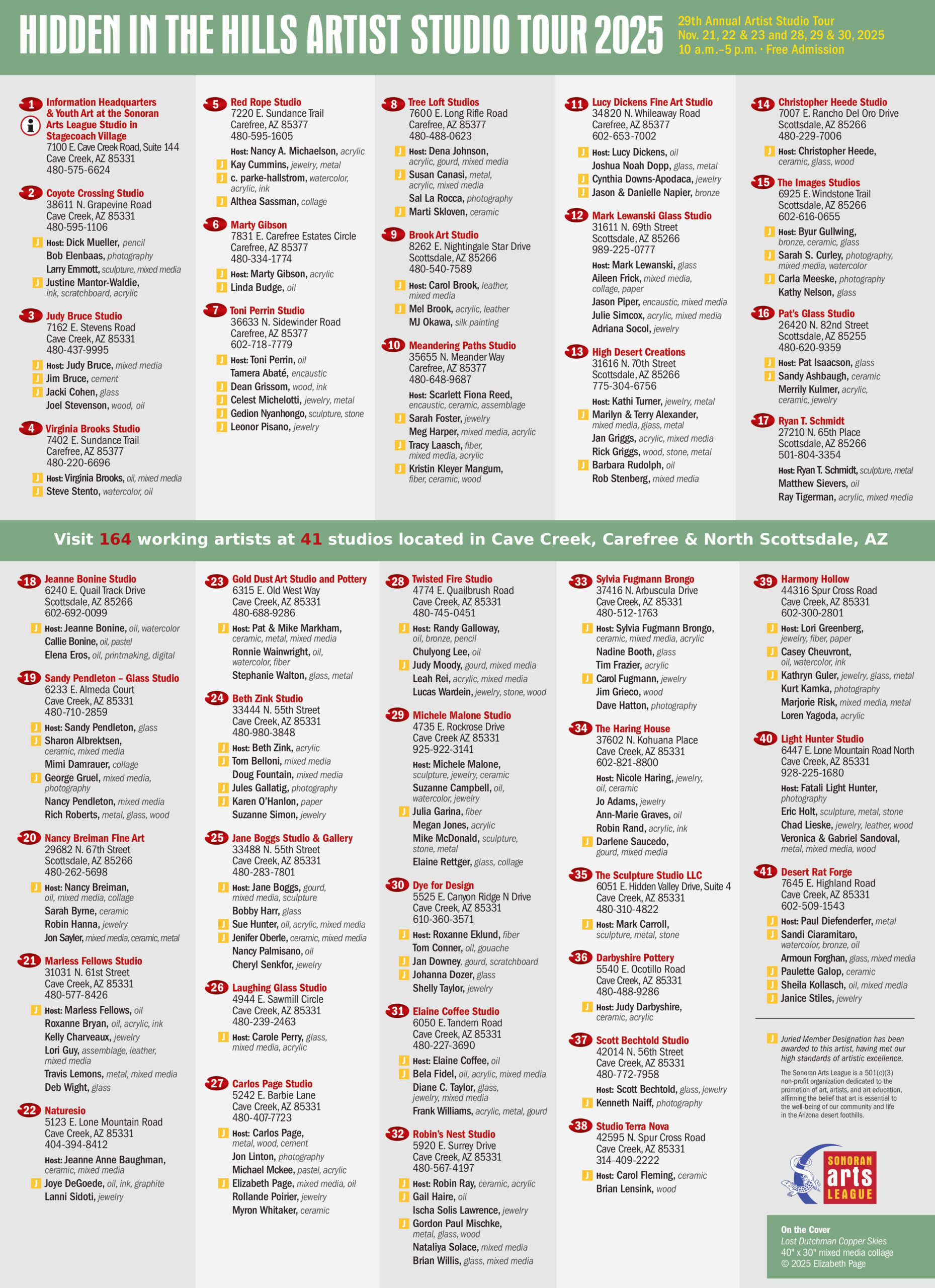 The Hidden in The Hills Artist Studio Tour, presented by the Sonoran Arts League, provides an opportunity for the public to visit the workspaces of dedicated artists in the Sonoran Foothills, to learn about the artist’s methodology and process, and purchase art directly from the artists in a friendly, engaging atmosphere that showcases quality art.